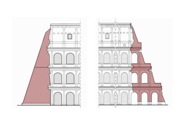On the other hand, the second intervention, carried out by the architect Valadier (1826), had the aim of fixing the same structural problem by means of imitating and re-establishing the old arches, thereby creating a community between the existing and the new project. This kind of rehabilitation favors the global picture of the monument, putting more emphasis on the symbolic and social value. (Figure 3)