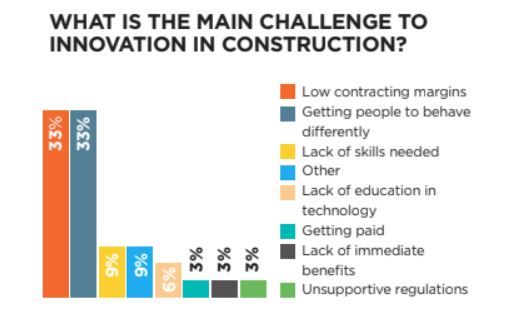 The four main challenges identified were: Lack of industry collaboration Attracting and retaining talent Weak culture of innovation Lack of industry representation According to MEED construction industry survey, the companies themselves identified low contracting margins and people’s behavior as the biggest barriers to innovation.