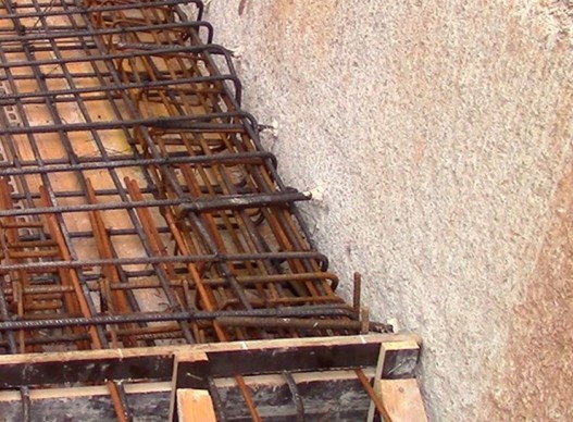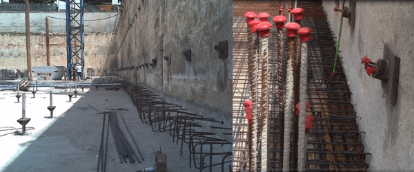 En cualquier caso, por tratarse de una unión entre dos sistemas constructivos, lo habitual es realizarla mediante elementos mecánicos. En función de los esfuerzos que se deban transmitir y del presupuesto, podemos escoger entre dos soluciones. La más habitual es asegurar la transmisión por esfuerzo cortante, mediante conectores formados por barras de armar ancladas a la pantalla con resinas de epoxy. Esta conexión nos asegura que si el hormigón está confinado, puede trabajar en compresión biaxial y de esta manera mejorar su comportamiento en la zona de unión. Fijémonos, en las fotografías adjuntas, como se anclan las esperas, mediante unión epoxídica, y muy importante, la conexión ha de estar embebida en un zuncho perimetral que permite rigidizar la unión, absorbiendo los esfuerzos de torsión que aparecen en la unión.
