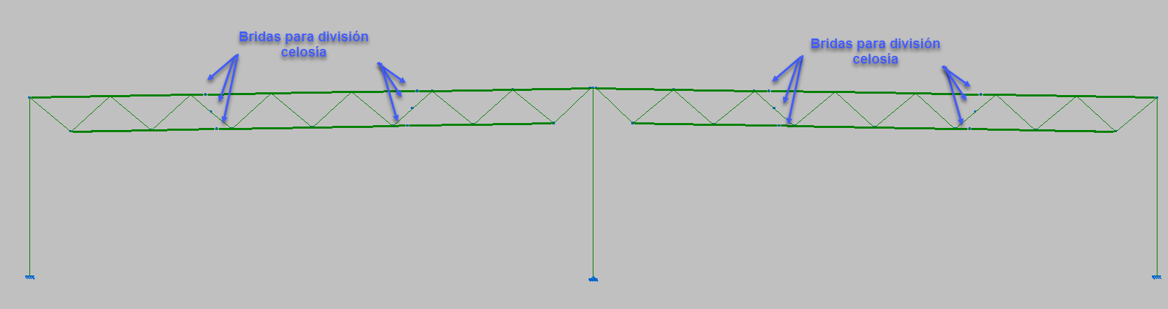 Todos los elementos cumplen por resistencia y por flecha, los desplazamientos verticales y horizontales se consideran admisibles. Es importante en esta fase definir dónde ubicaremos las bridas de conexión. Como la celosía de 38m de luz no es manejable para un transporte normal por carretera, decidimos fragmentar la celosía original en tres “sub-celosías”. Incorporamos estos nudos de división en el modelo: