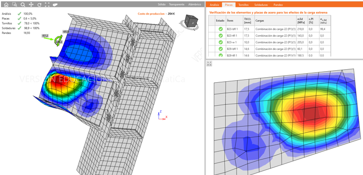 Optamos por una distribución de pernos lo más simétrica posible entre el perfil principal (dintel) y la cartela, con 6 filas de tornillos y sin rigidizadores en el alma de la columna. Con una operación de “placa de testa” y otra de “cartela” tenemos configurada la conexión.