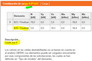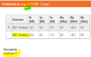 De nuevo las combinaciones 22 y 9 son dominantes en términos de cortante. Añadimos también la combinación 17 a nuestra lista de combinaciones dominantes debido a los esfuerzos axiles. Es con esta combinación cuando se genera el mayor axil positivo en el nudo estudiado: