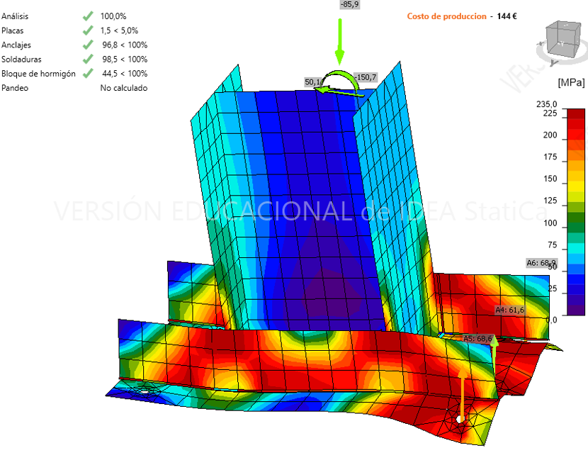 Analizamos resultados. Tanto placas (deformación plástica), tornillos, soldaduras y pandeo cumplimos.