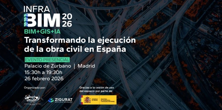 El próximo 26 de febrero, el Palacio de Zurbano (Madrid) acogerá una nueva edición de InfraBIM, el foro que desde 2017 se ha consolidado como uno de los principales puntos de encuentro sobre digitalización de la obra civil en España. El evento, organizado por ZIGURAT Institute of Technology y el Colegio de Ingenieros Técnicos de Obras Públicas de Madrid (CITOP Madrid), contará de nuevo con aforo limitado a 100 personas y un programa centrado en la convergencia BIM + GIS + IA aplicada a infraestructuras reales.